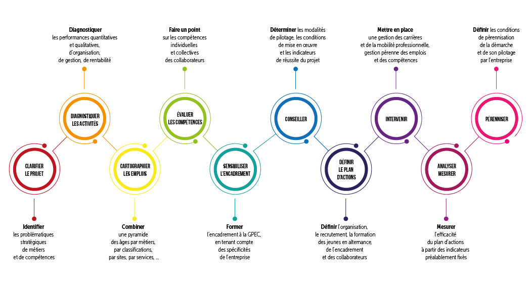 Déployer une démarche GPEC suppose d’impliquer tous les acteurs de l’entreprise : direction générale, direction des ressources humaines, directeurs de sites, responsables d’activités, collaborateurs. Des outils d’analyse permettront de faire un diagnostic des ressources humaines en croisant les données sociodémographiques (pyramide des âges, listing des emplois, organigramme, ancienneté, turn-over, performances quantitatives et qualitatives des activités, …). Cet état des lieux mettra en perspective les métiers les plus sensibles et les actions à effectuer pour anticiper le besoin en compétences.