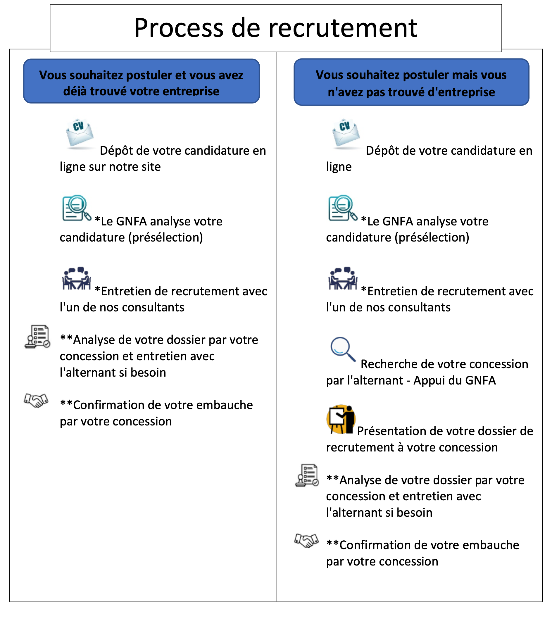 Oui, c’est à l’alternant de trouver une entreprise dans le secteur automobile- Le GNFA pourra vous accompagner dans votre démarche si et seulement si, des entreprises ont exprimés leurs besoins sur votre secteur géographique et nous proposerons alors votre dossier de recrutement.